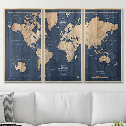 Our push pin travel maps are printed on premium stretched canvas and wrapped around an internal wood frame. There is a durable ½” layer of eco-friendly wood fiber pin board in between this internal piece and the canvas map print, so that when you place pins, they stay snugly in place.
