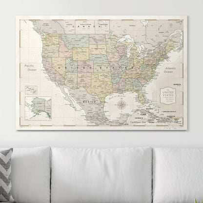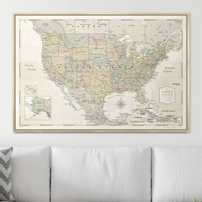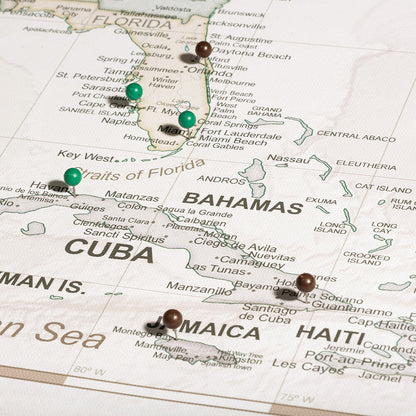 Our push pin travel maps are printed on premium stretched canvas and wrapped around an internal wood frame. There is a durable ½” layer of eco-friendly wood fiber pin board in between this internal piece and the canvas map print, so that when you place pins, they stay snugly in place.