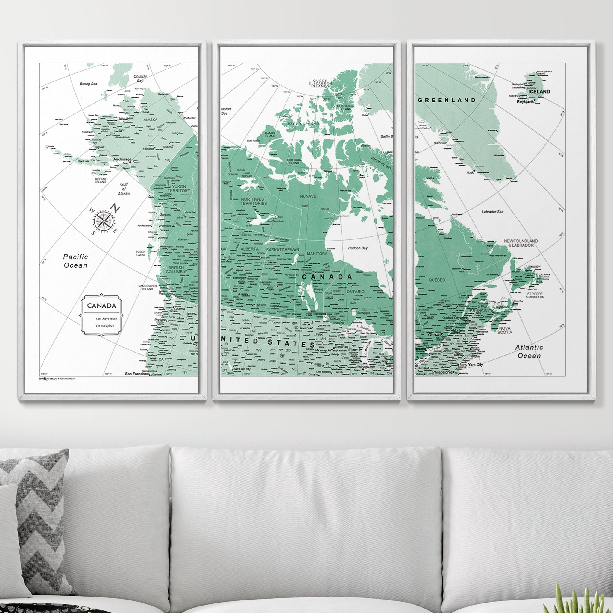Our push pin travel maps are printed on premium stretched canvas and wrapped around an internal wood frame. There is a durable ½” layer of eco-friendly wood fiber pin board in between this internal piece and the canvas map print, so that when you place pins, they stay snugly in place.