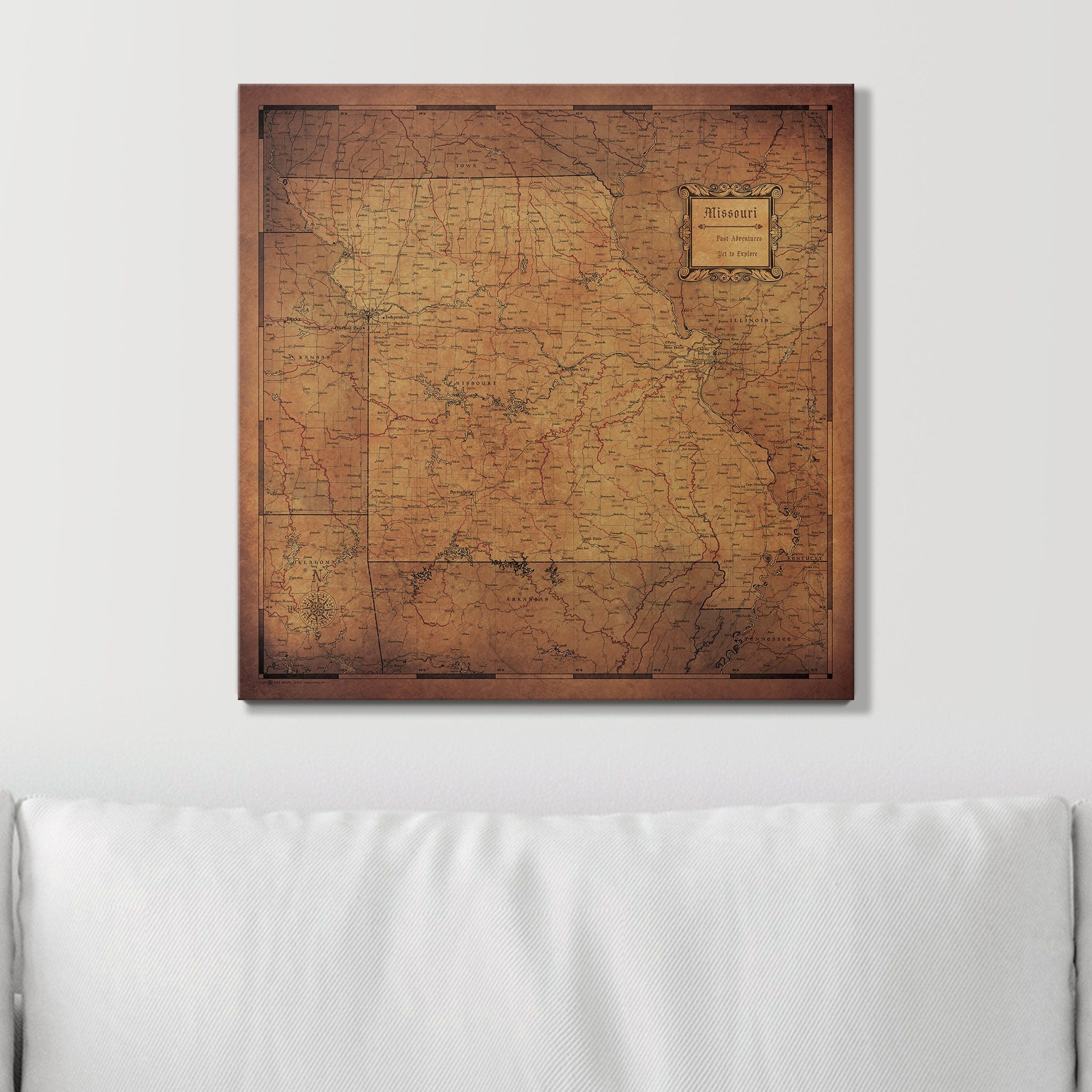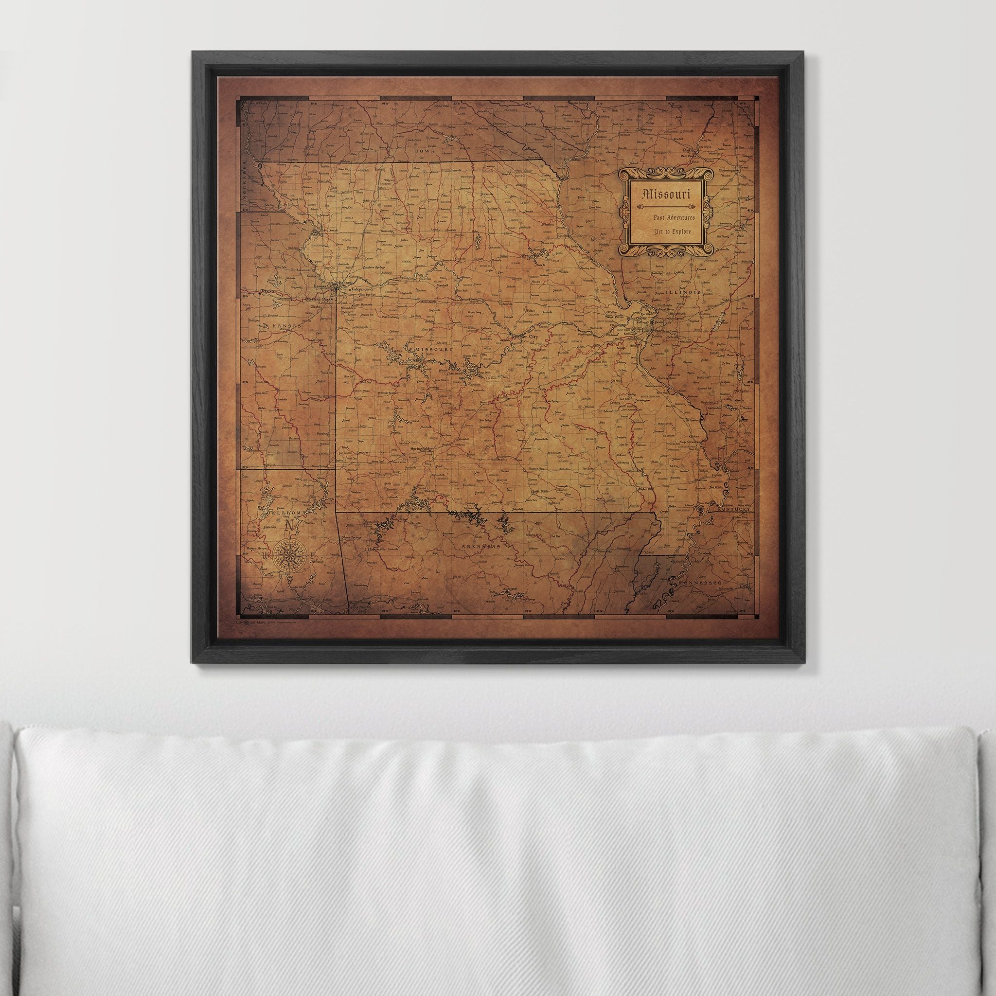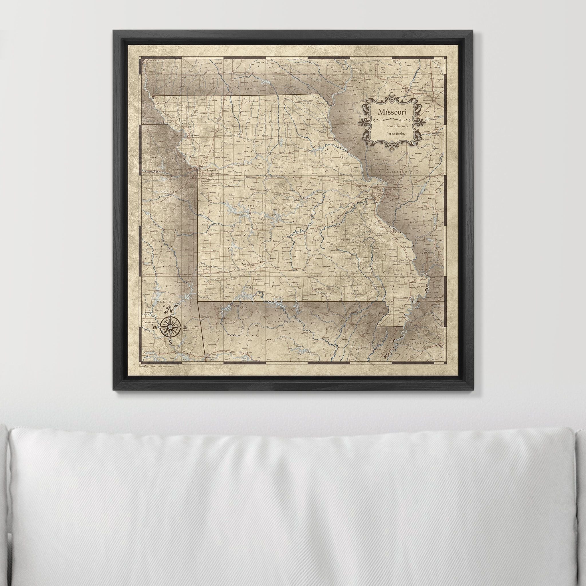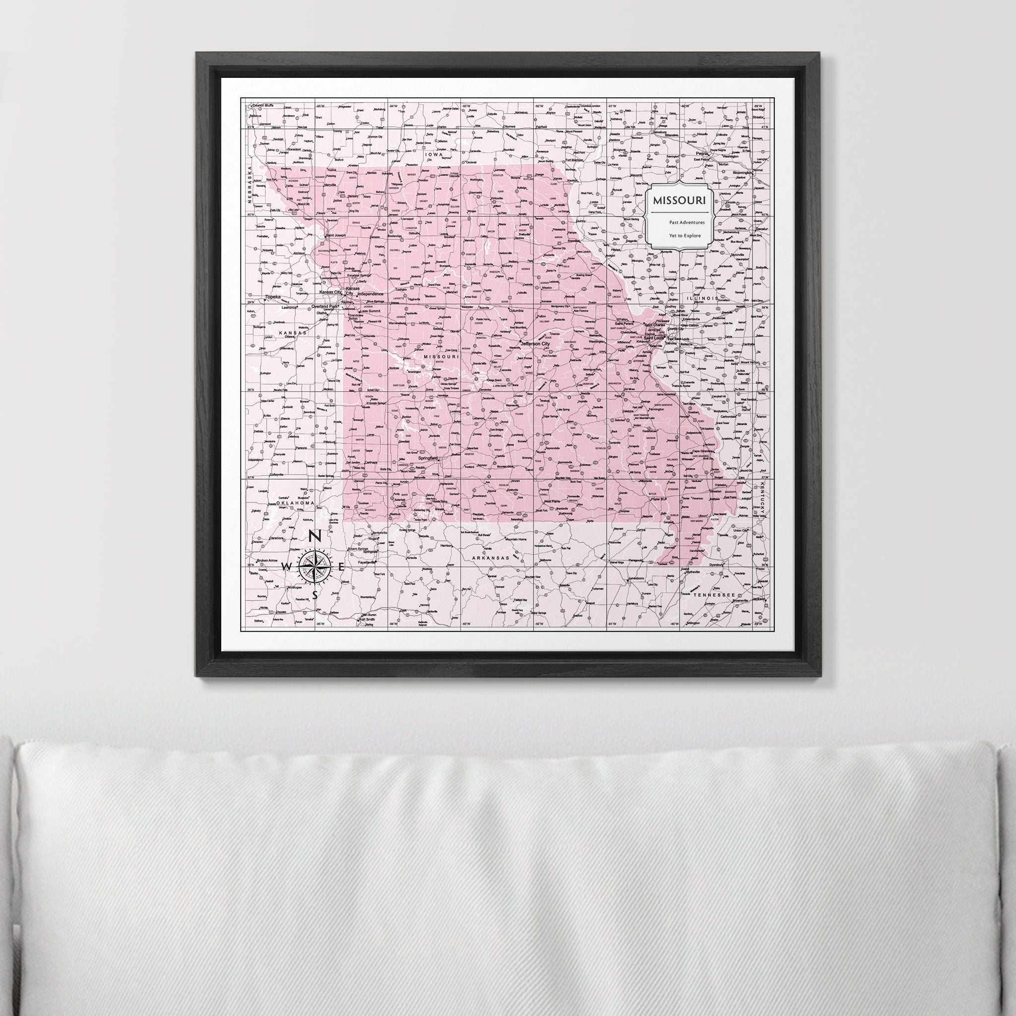 Choose from a variety of map designs to find the perfect Missouri map that reflects your individual style. Personalize your own legend, select two complementary push pin colors, and explore our optional decorative frames to create the ultimate travel map for your Missouri adventures!