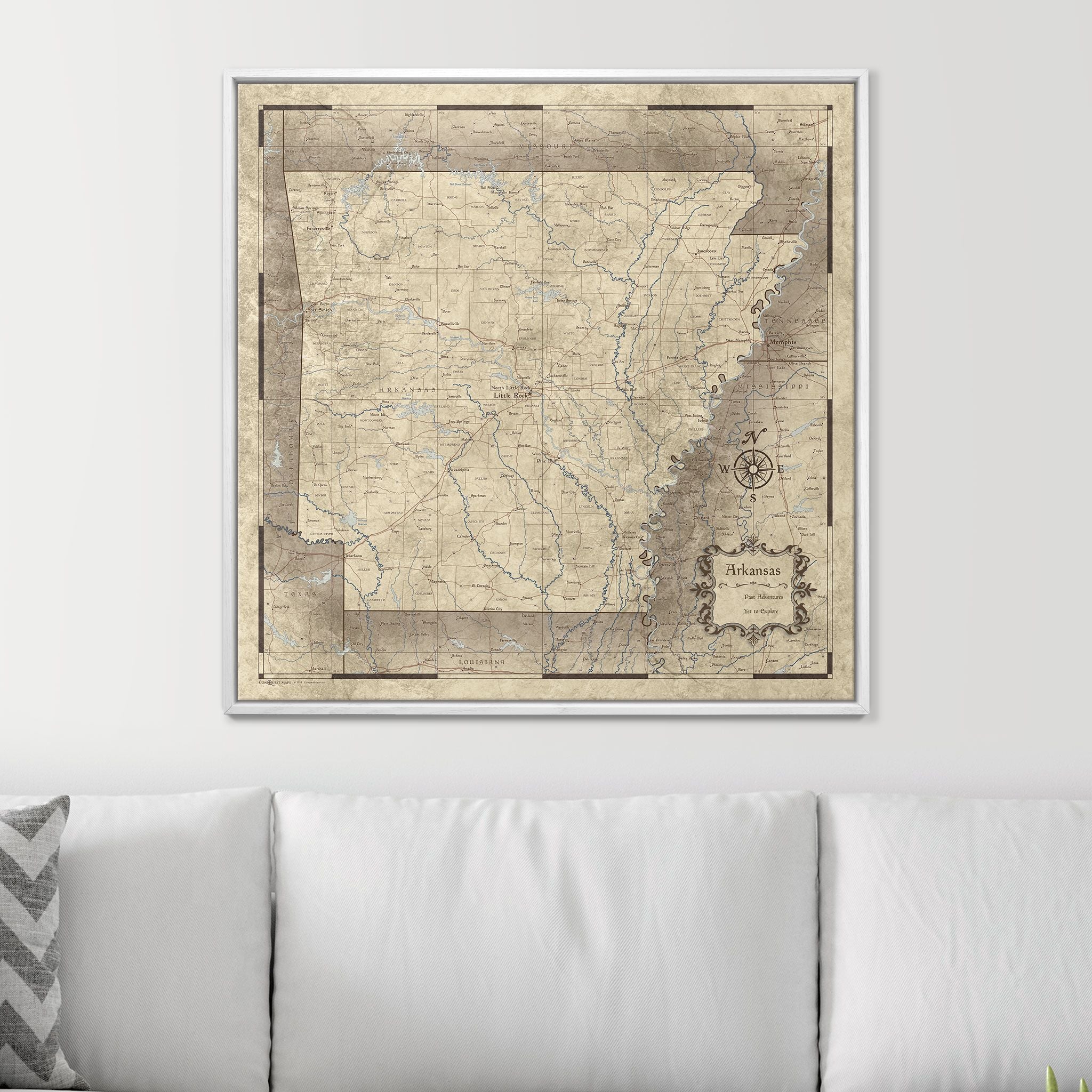 This is a floating frame style, common with stretched canvas pieces, allowing you to see the sides of the print and pin your map with ease.