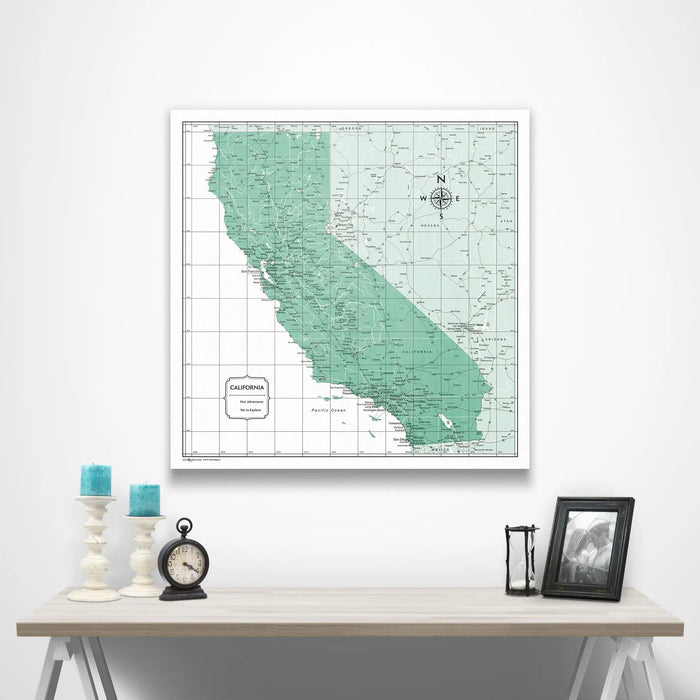 Our push pin travel maps are printed on premium stretched canvas and wrapped around an internal wood frame. There is a durable ½” layer of eco-friendly wood fiber pin board in between this internal piece and the canvas map print, so that when you place pins, they stay snugly in place.