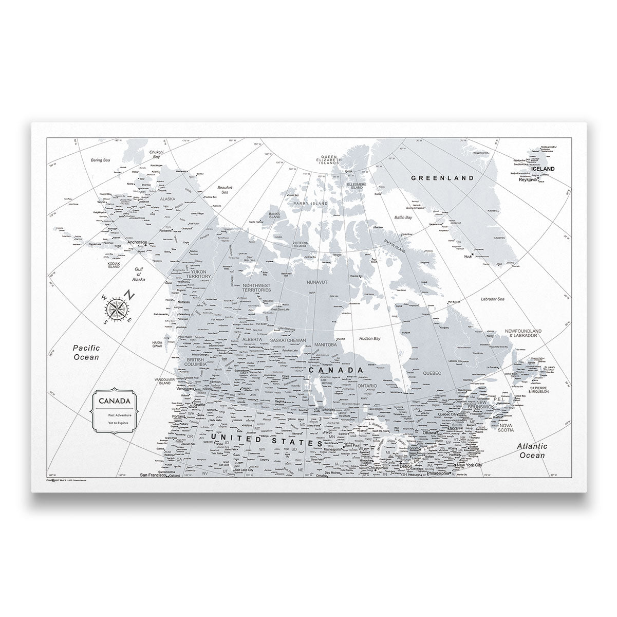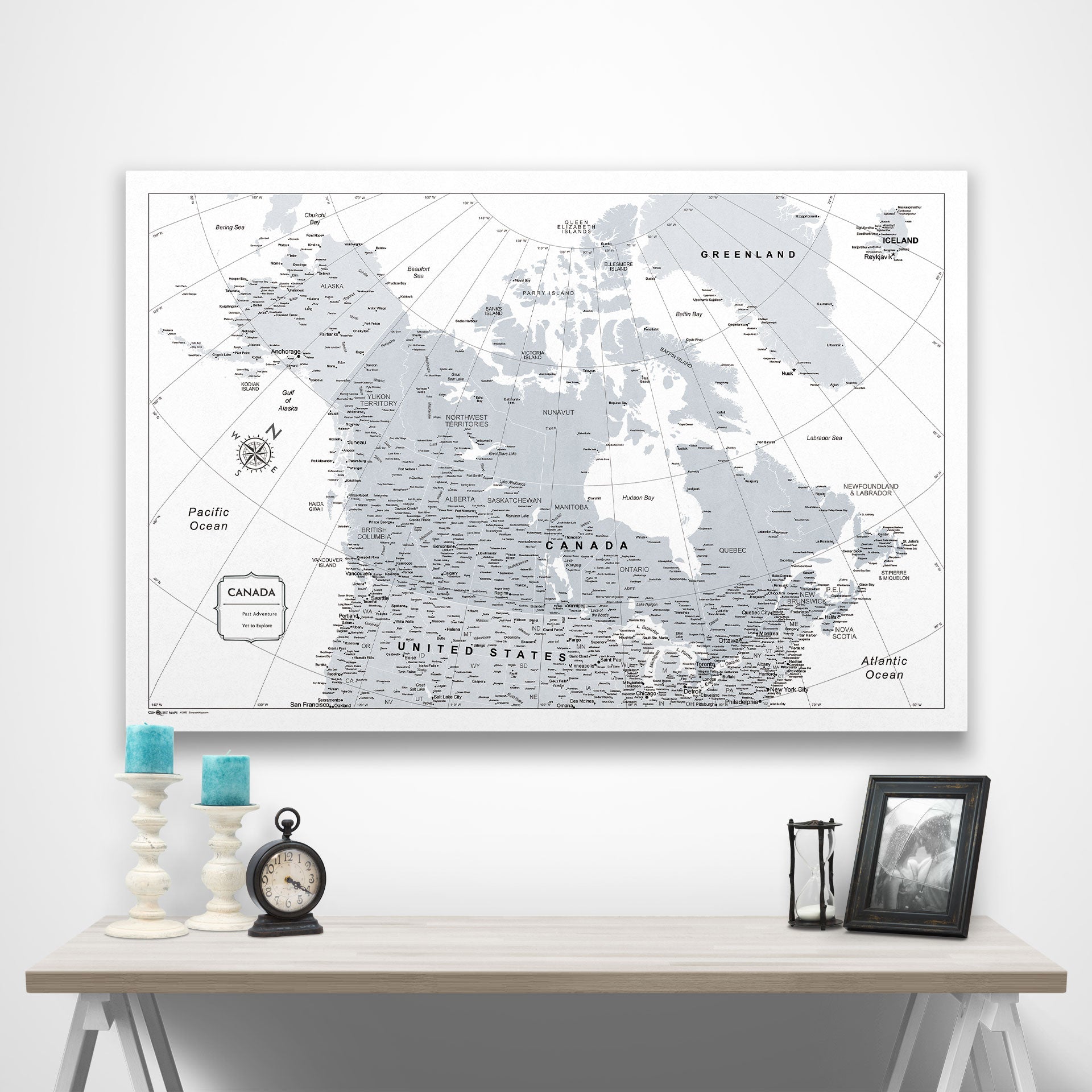 Want to keep it neutral? The Light Gray Color Splash Canada map is a crisp, clean canvas that is ready for you to pin all of your travel goals and memories! The light gray canvas makes this a soft but powerful statement piece in your home decor.