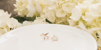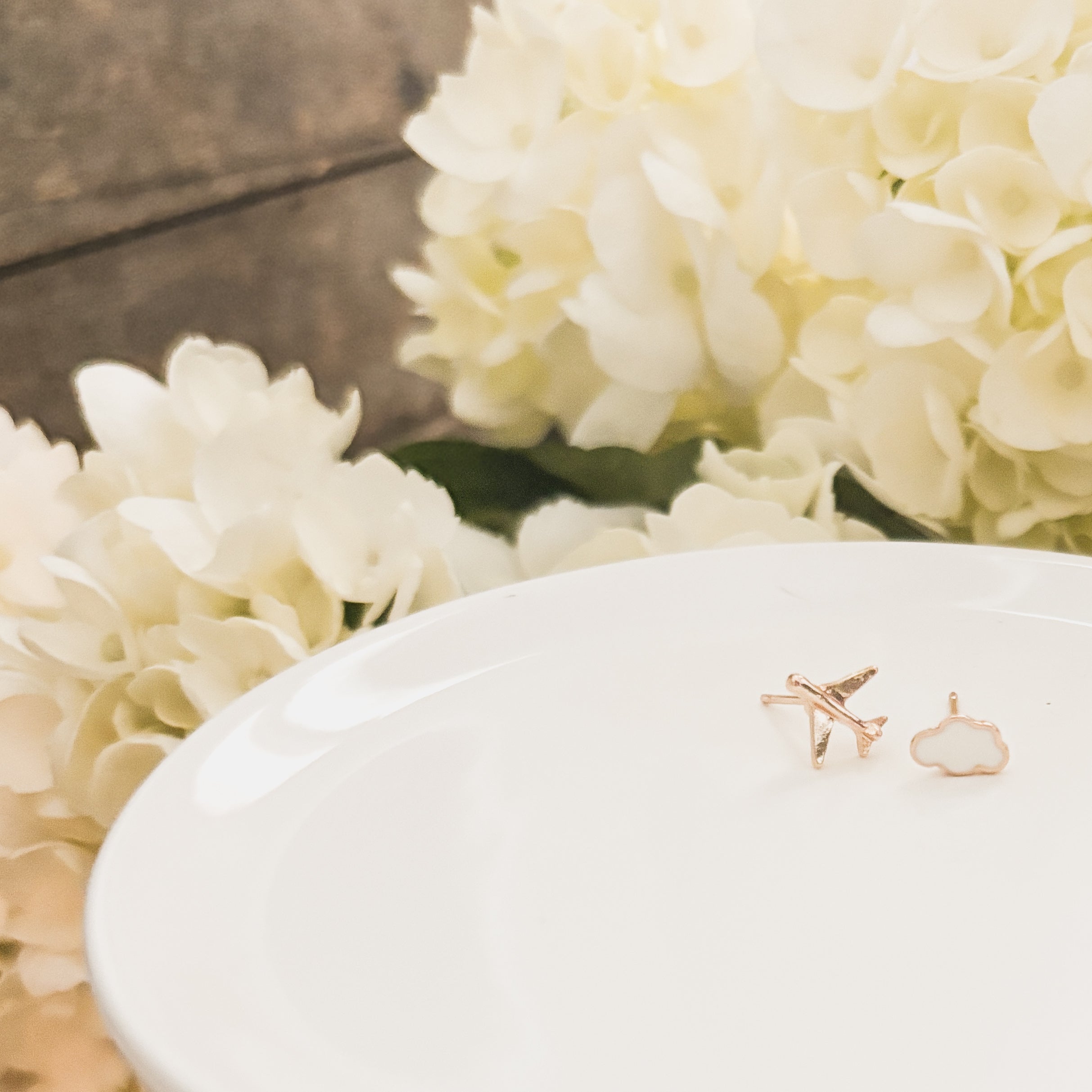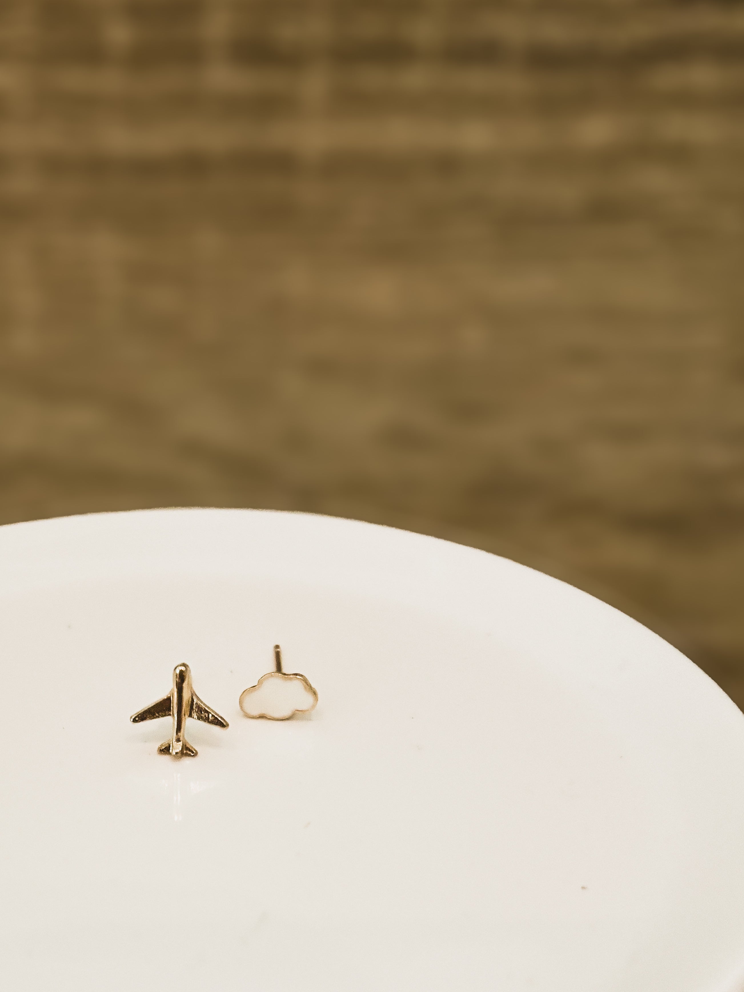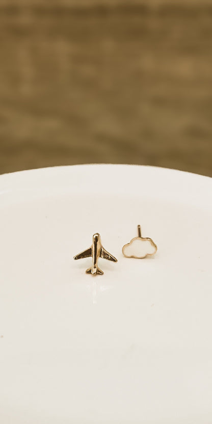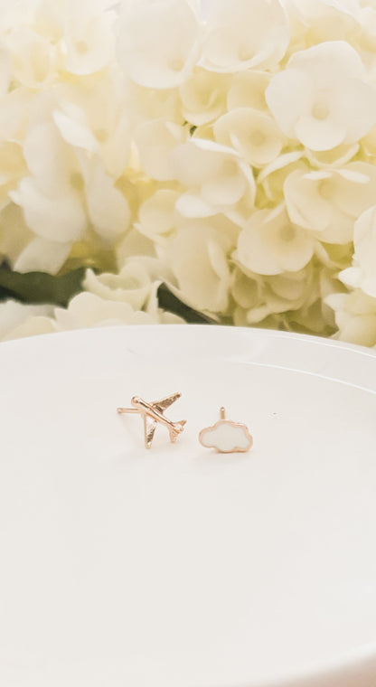 These adorable cloud and airplane stud earrings are here to add a travel-loving twist to your wardrobe. Whether you're a fan of flying high or just love whimsical accessories, these earrings are perfect for you to showcase your playful side. So go ahead and make a statement with these adorable accessories -- they're guaranteed to make you smile (and make a great conversation starter)! Whether you're dressing up or dressing down, these will add a touch of charm and uniqueness to any outfit.