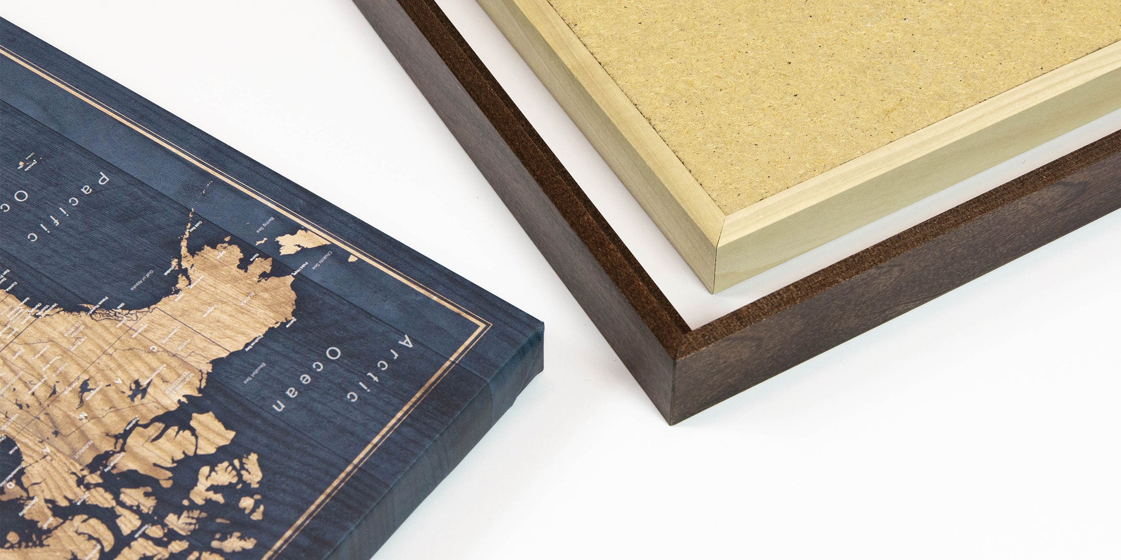 Our push pin travel maps are printed on premium stretched canvas and wrapped around an internal wood frame. There is a durable ½” layer of eco-friendly wood fiber pin board in between this internal piece and the canvas map print, so that when you place pins, they stay snugly in place.
