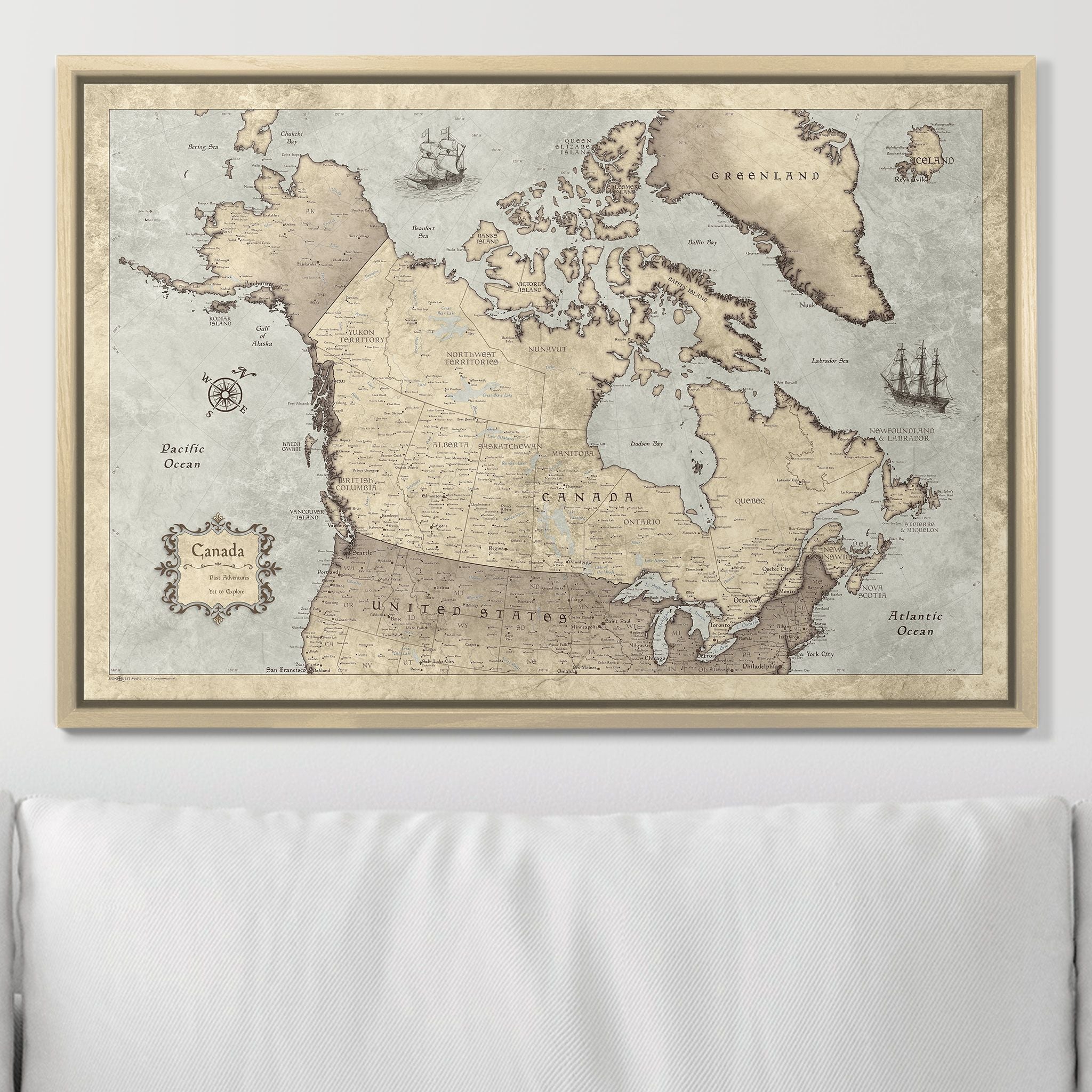 This is a floating frame style, common with stretched canvas pieces, allowing you to see the sides of the print and pin your map with ease.