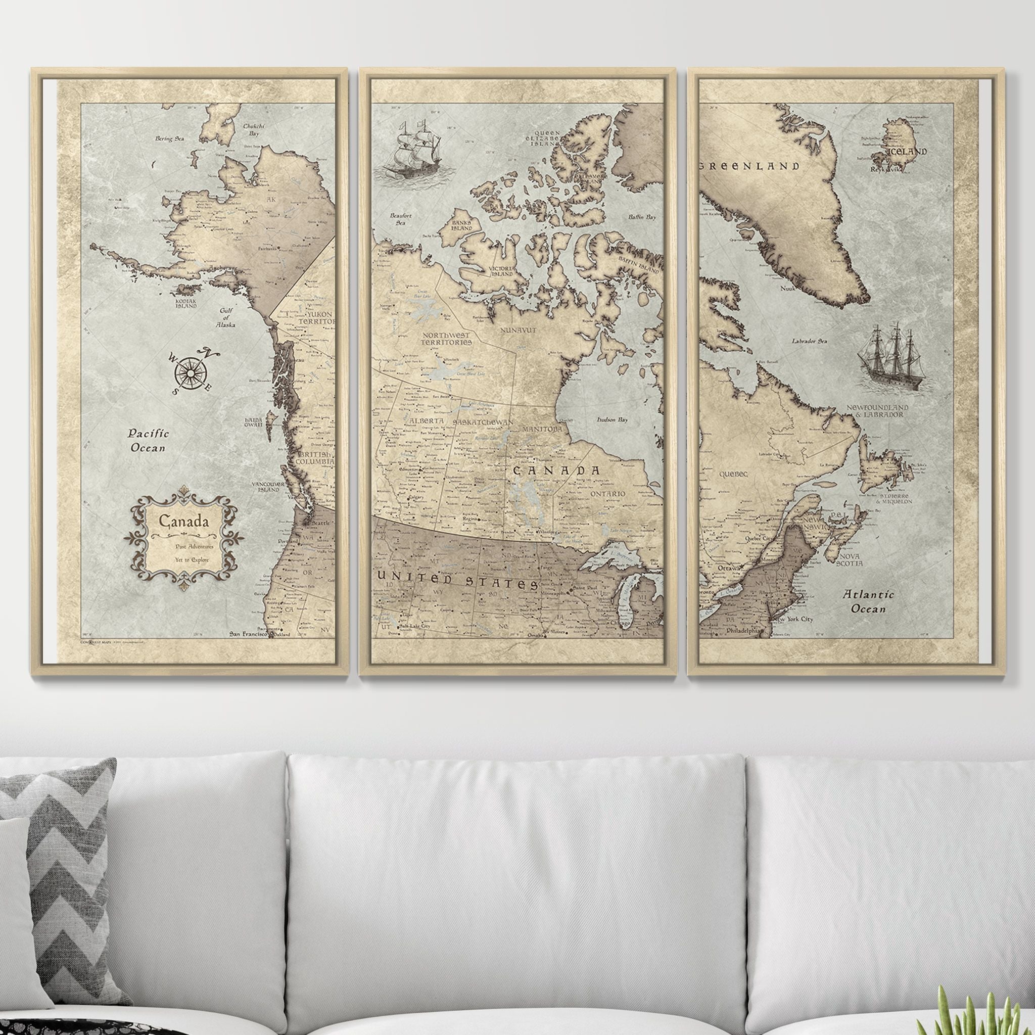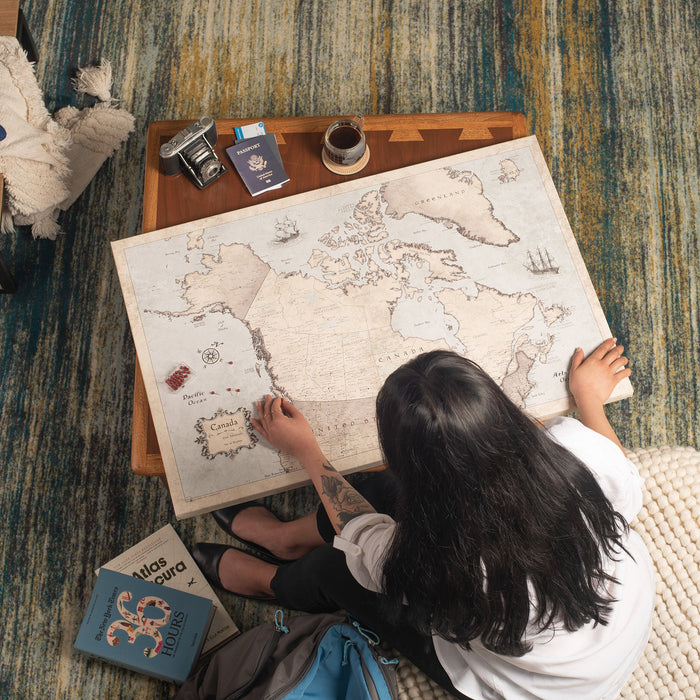 Our push pin travel maps are printed on premium stretched canvas and wrapped around an internal wood frame. There is a durable ½” layer of eco-friendly wood fiber pin board in between this internal piece and the canvas map print, so that when you place pins, they stay snugly in place.