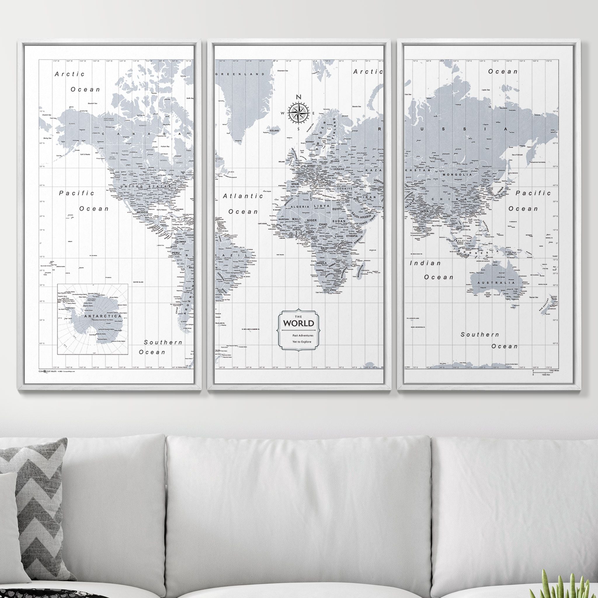 Our push pin travel maps are printed on premium stretched canvas and wrapped around an internal wood frame. There is a durable ½” layer of eco-friendly wood fiber pin board in between this internal piece and the canvas map print, so that when you place pins, they stay snugly in place.